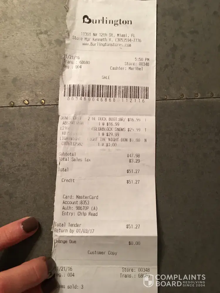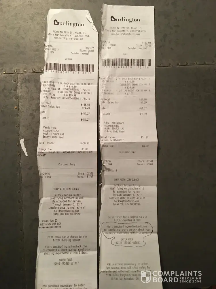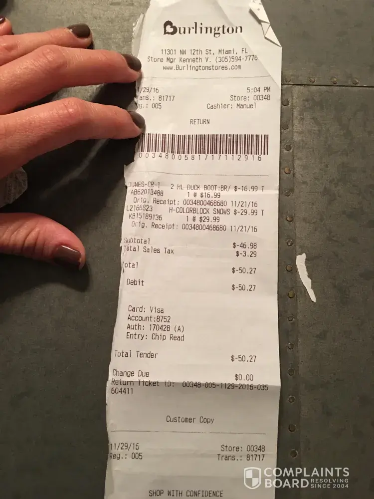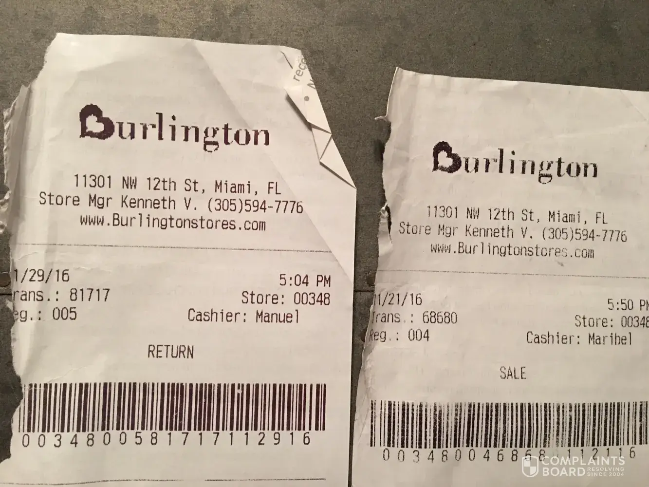 Consumer complaints about Burlington Coat Factory Defective ... Burlington Coat Factory, Seminole, FL - My mother purchased a sale item and had to return it. ... It's not worth going through this in order ... The Burlington Coat Factory - No Cash Refund