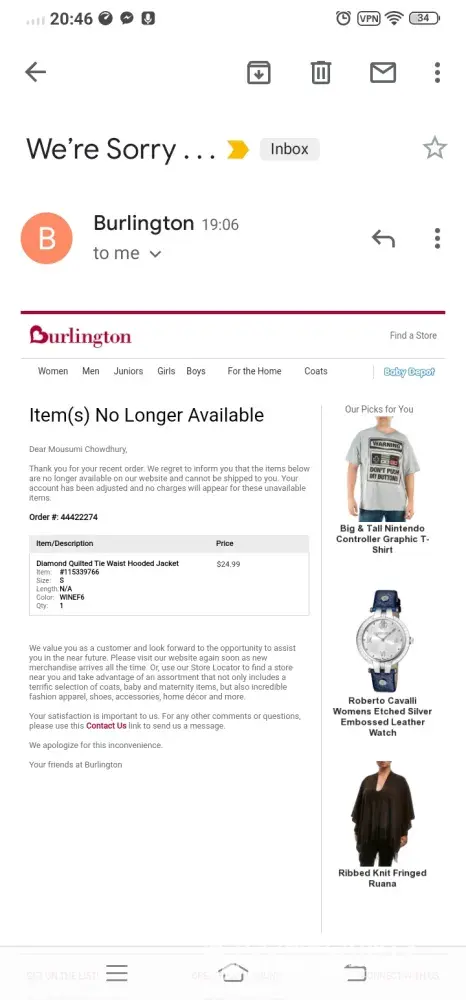 Very bad costumer return service ... I spent most of my money to buy from Burlington but when I had a problem with a top to my son they was very rude & refused to return it .. They made feel very bad cuz she can saw I spent more than 600 & the top was for 10 dollars... I'll never go to buy from them, . They should learn how to respect coustemrs