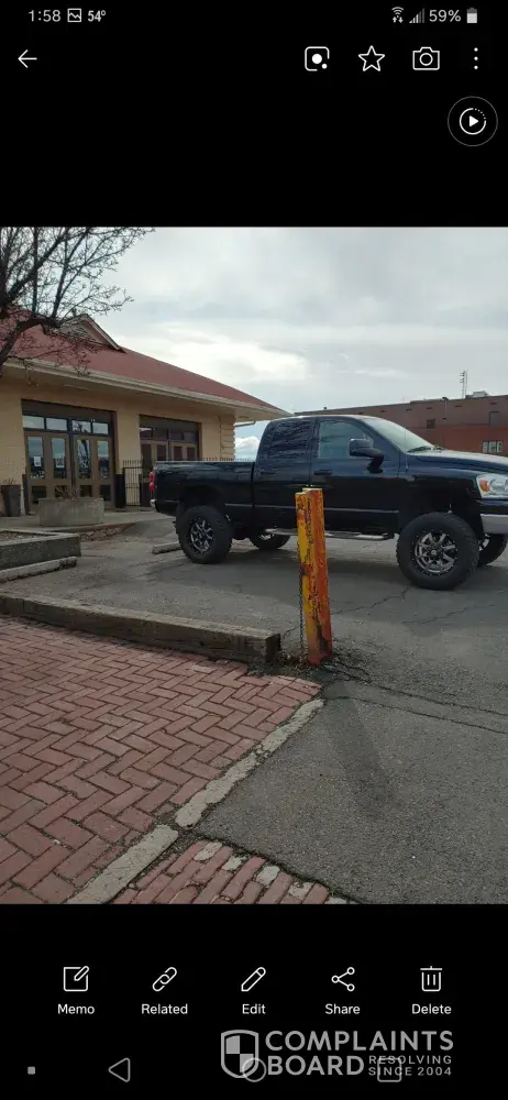 As I wasn't able to park in the street to attend a baby shower. @ 32 front Street. I backed into a empty space in my truck. Upon leaving as I didnt see due to odd location. Rubbed against something n stopped when I noticed a piece off RR track used as a saftey pole? Or chain? I don't see how its safe or legal. Was minor damage few $100 damages to step bar and pretty nasty scratched. Please let me know. I am agrivated as I dnt know what to do. I was parked in the space directly next to object. I took these pictures and sent a complaint to city of yakima. Said property was yours.