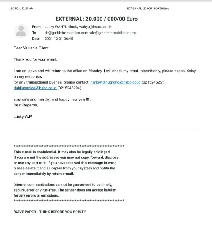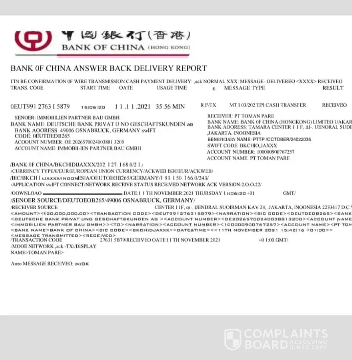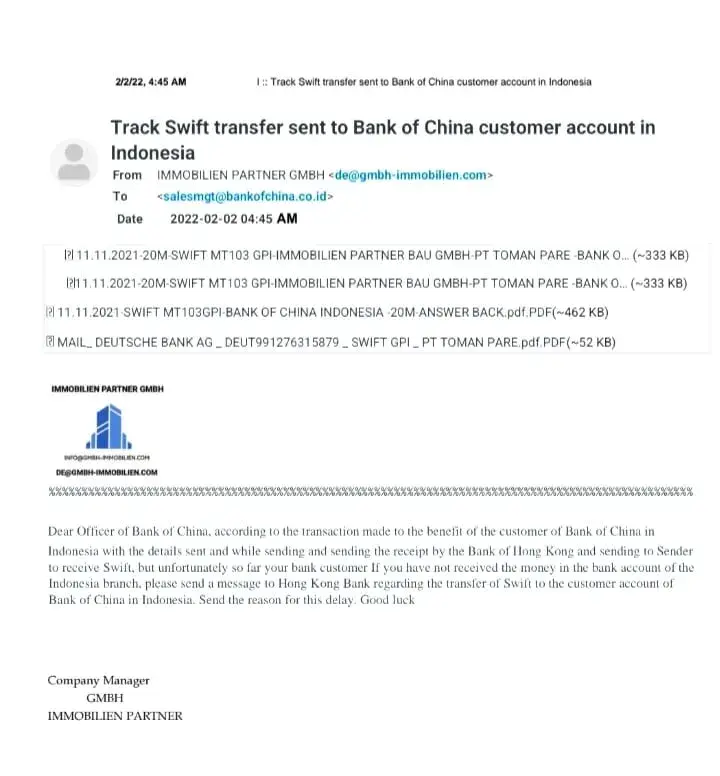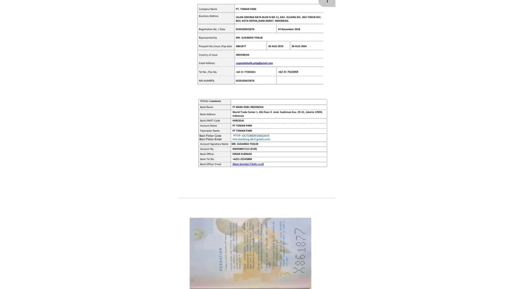 According to the available documents of the company pt toman pare Registration No. / Date [protected] November 2018 To the management of Mr. Soganda Talib due to requesting financial resources and requesting 60 million Euros in 3 different Indonesian banks with China Bank account and HSBC and BNI Negara in each separate account amounting to 20 million...