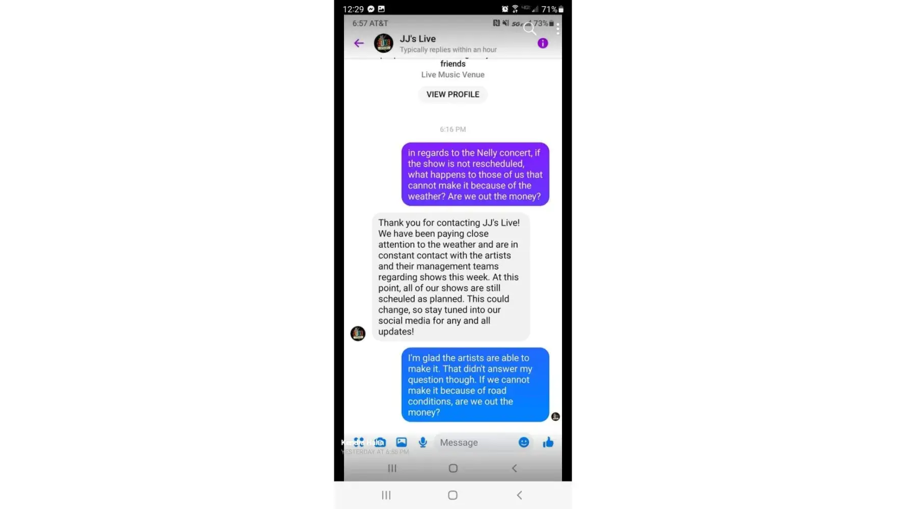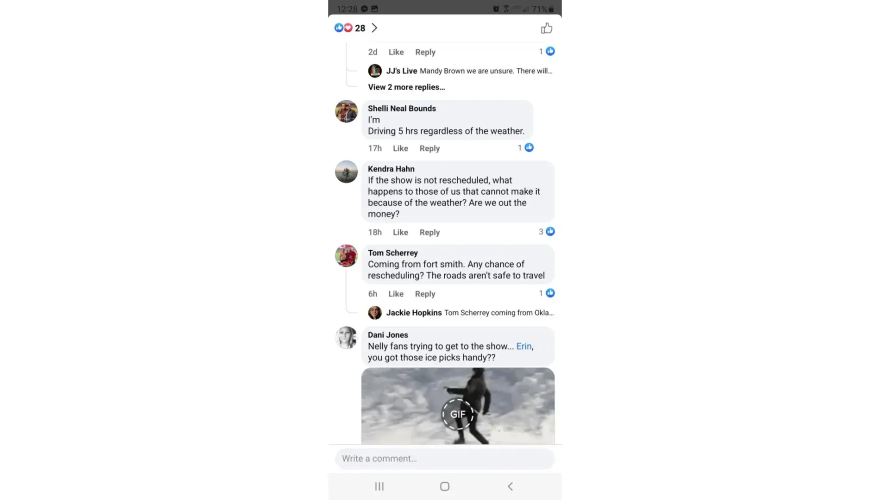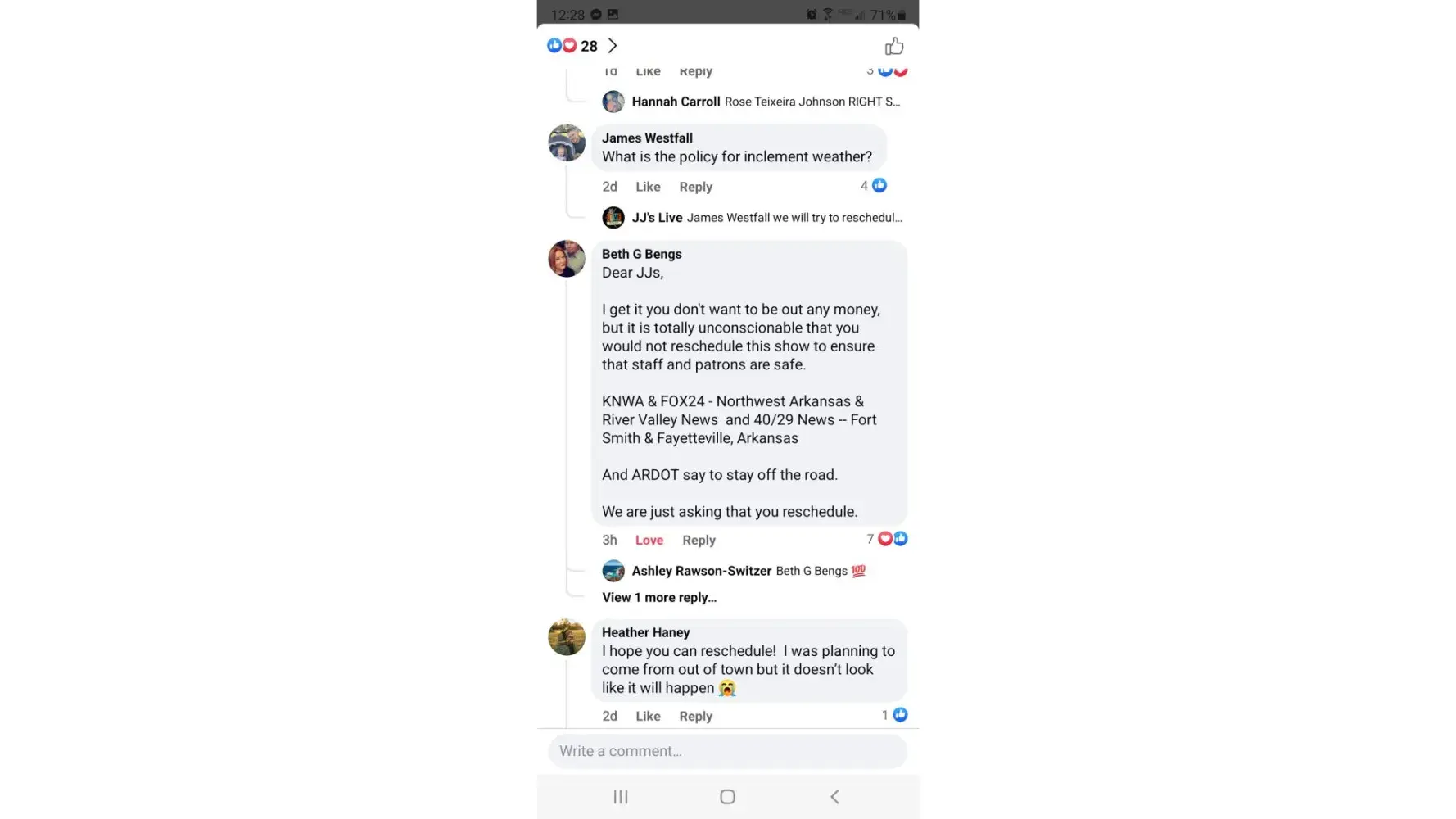 I recently purchased some tickets and meet and greet for a concert a JJ's live at Fayetteville Arkansas. The concert was to be taken place today 2/24/22. Of course, if you bring up the weather report there is tons of ice and unsafe weather conditions all across the state as well as in Fayetteville Arkansas. (including snow, ice, rain, sleet, projected high...