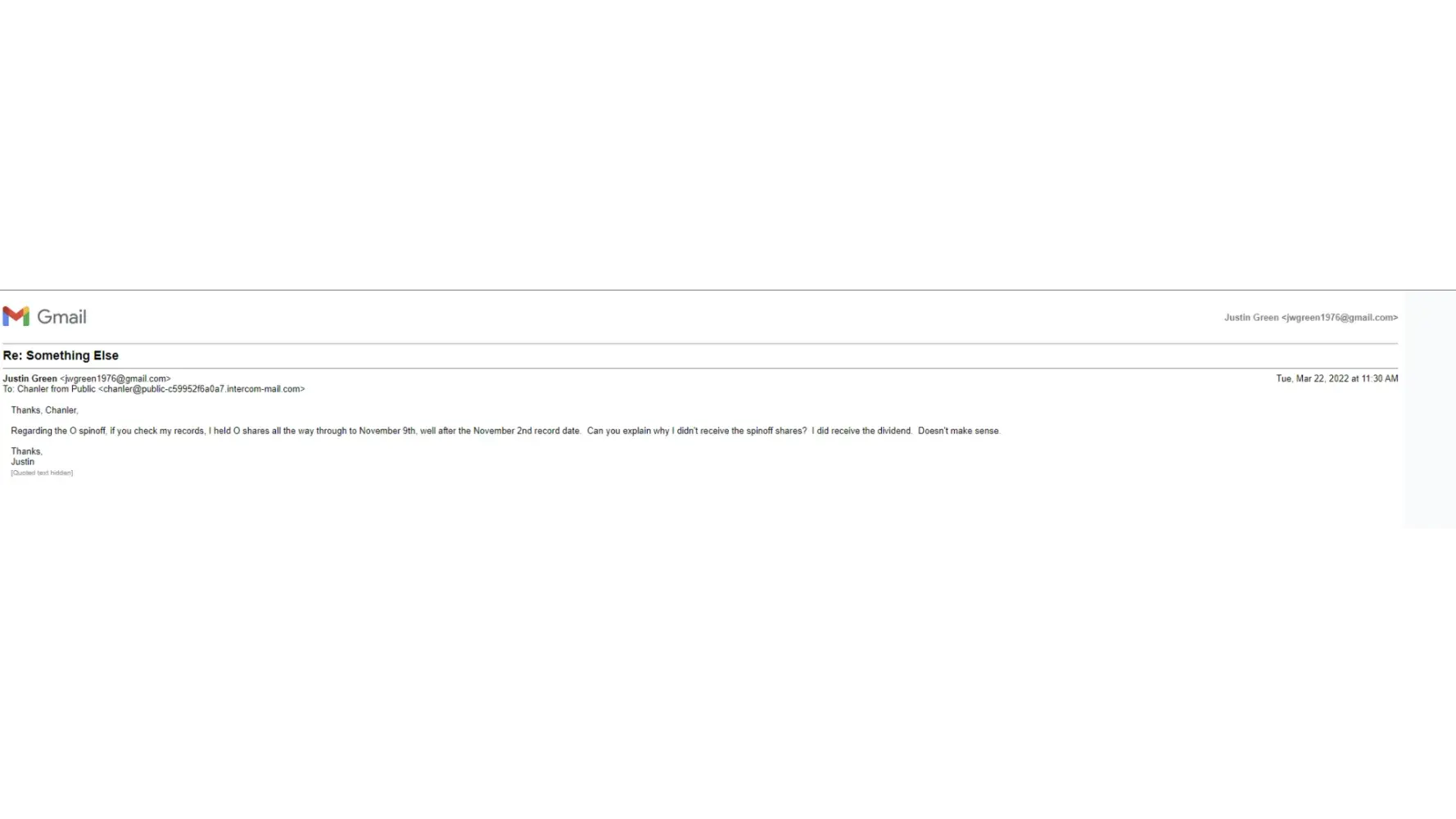 I previously filed a complaint against Public.com. Public.com responded numerous times with false and incorrect information, and provided no backup or proof of their claims. At issue was the spinoff of O shares to ONL shares for holders of record as of 11/2/2021. Public.com persistently claimed that the record date for receiving the shares and cash...