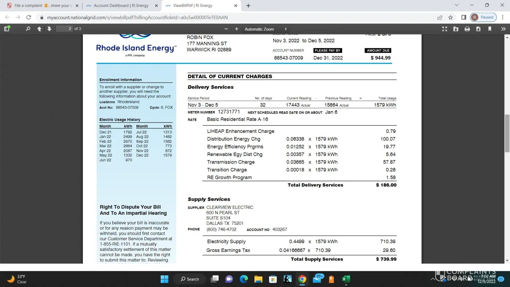 On 12/8/22, I received my electric bill from RI Energy. My bill was up to date at the time of its issuance. It indicated that my family used 1579 kwh for Nov-Dec. The charge was $944.99. While I don't dispute the usage because my house runs solely on electricity, the charge is astronomical. I called RI Energy to discuss this charge. I spoke with a lady by...