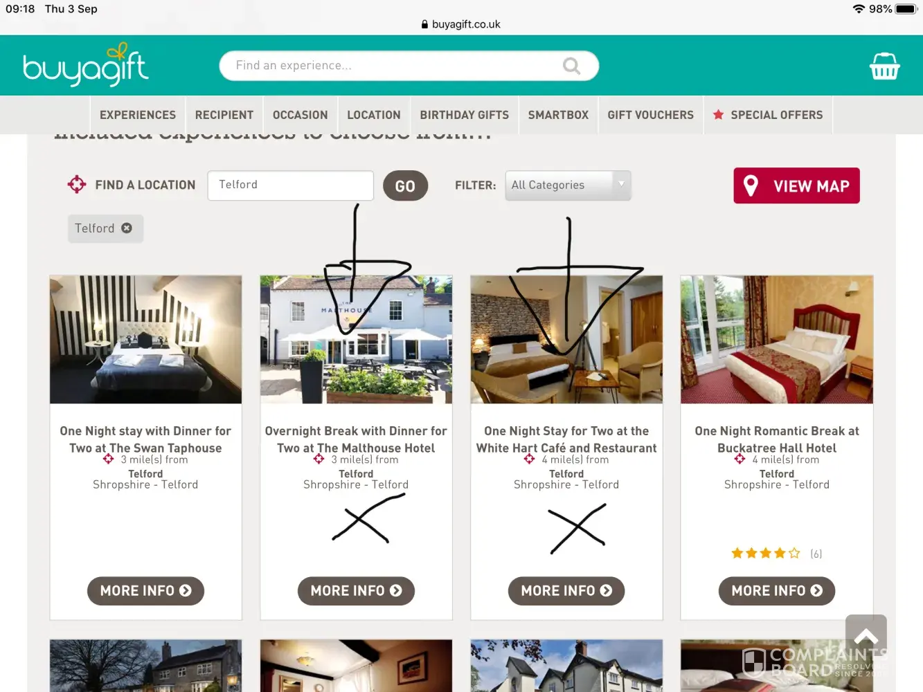 Why and how are you able to advertise the stays on your live web page when they are Not using buy a gift this is a trading standards issue and very miss leading, and should not be on your web sight at all Covid or no Covid, i have taken a snap shot of the page and hotels in question,