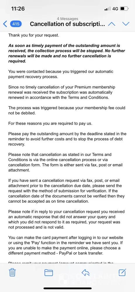 Confirmation as cancellation I then received terms on email with another payment demand and threatening to increase bill for unpaid fees. I have now received a letter in post demanding payment for a collections company which I'm guessing they own. I have registered them with Action Fraud which deals with Web crime.