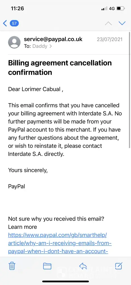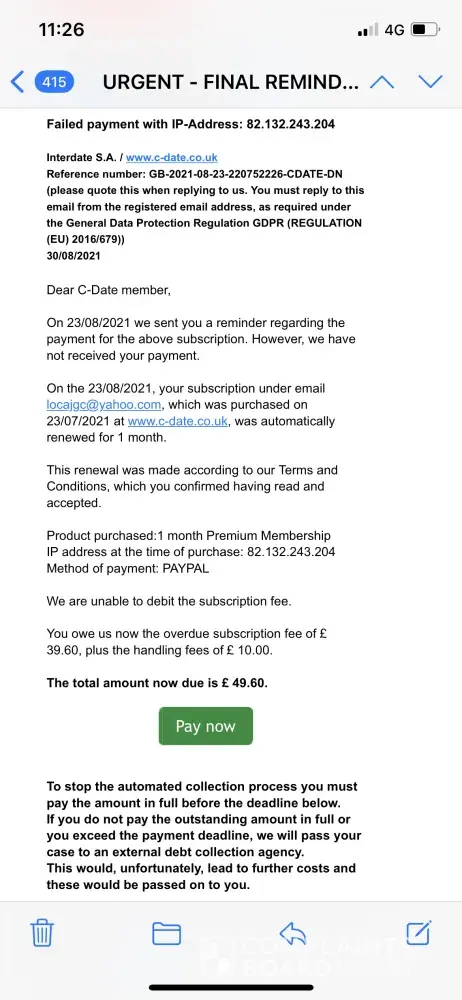 Hi I signed up for a month with c-date but then cancelled my subscription through PayPal less than a week later as I realised it was full of fake contacts and nothing but scams. I received an email at the end of the month informing me now I have to pay a debt of £49.60. There collection team have replied saying they have not received any cancellation and that I'm liable to pay the debt as I have triggered their automated payment service reminder period.I have proof of the cancellation on the date from pay pal indicating I gave plenty of time prior to the renewal date.