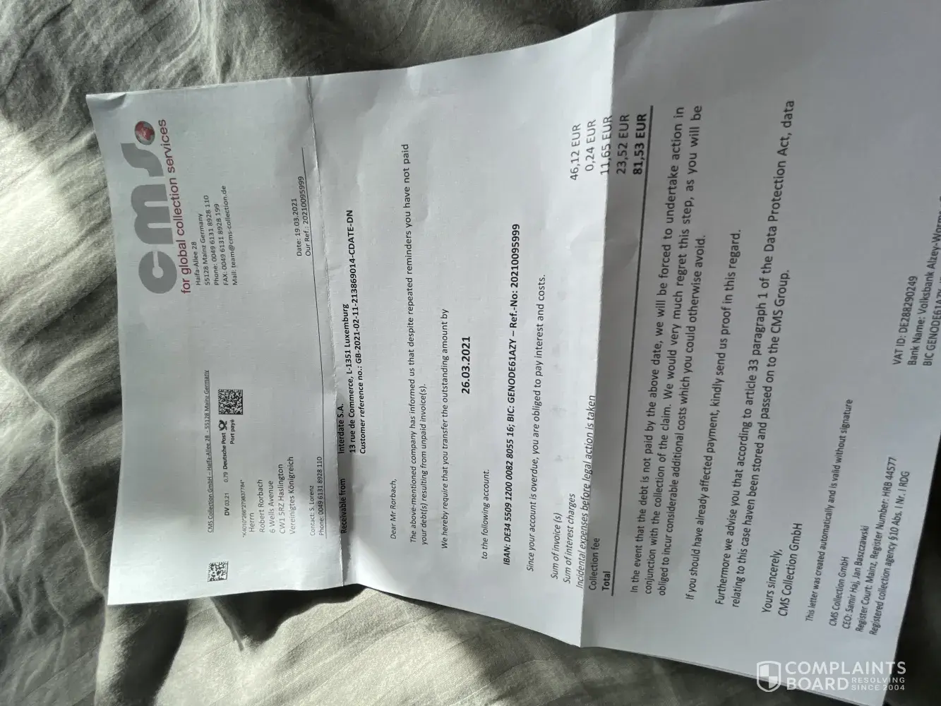 Thinking this was all now sorted I get a letter from CMS global collection services requesting a payment including charges 77.65 euro.