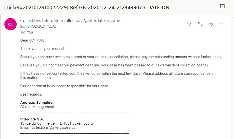 I have contacted Interdate with the details of the email sent and a screen shot of said email and there reply is this attached. Basically due to there incompetence they have put it in the hands of a debt collection agency. Would someone please tell me how to resolve this at your earliest opportunity.