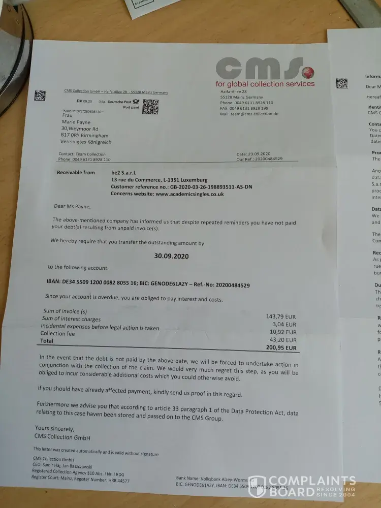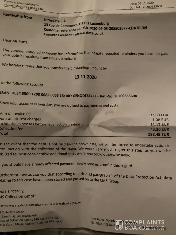 I never subscribed to C-date and know incurred debts. Received a letter today stating pay by 17/09/20 or incur more costs! There is not an English speaking person to talk too and only a fax number. How can you sort this out and I'm certainly not paying therefore you can contact CMS global management services and inform them there is NO debt to be collected. You can also delete me from your list!