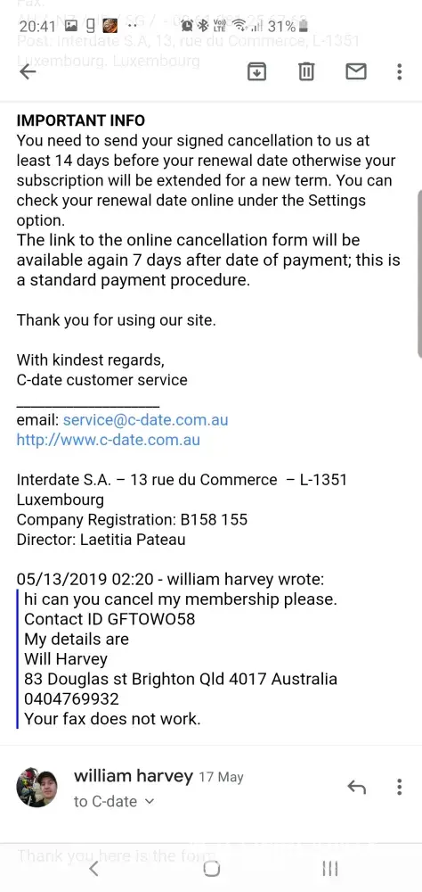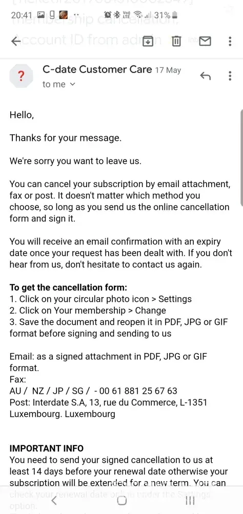 I've sent emails to service@c-date.com and had a email from them yesterday about a cancellation it's because I wish to cancel my membership. It tells me that the essential way to do it is a cancellation online form, to start of go to my membership and click (change) but when I clicked on membership it still says that my Account will be visible in the few days and it's already been past a few.