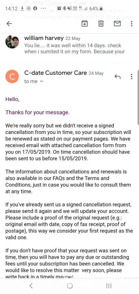 C-Date has sendt 2 requests about payment for a 3 months subscription, and in the second email they are trying to threaten me and blackmailing to get the money. I never wanted any of this after I paid for a 1 month subscription i sent an email to request to delete my account and cancel my subscription, sent a couple more emails, but no answer.