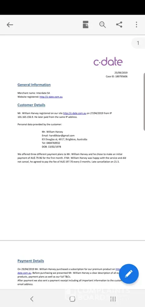 We're sorry to hear about your complaint - please do contact us at cs @ c-date . com (using your registered email address and adding ''Complaintsboard'' into the subject of your message) and explain the issues occurred; we'll do our best to help you.