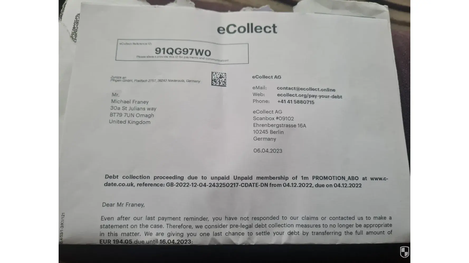 I joined this website a year and six months ago, now I am being chaise by a debt collection company in Germany. I tried to cancel my membership on the app, which was impossible, so I wrote to them via their email which was advertised on the application, but now they are saying the email was incorrect. The whole experience is a dreadful. I did try to make a payment to a Ecollect yesterday, but it failed. I am worried that Ecollect are a scammer. It feels like a scam business.