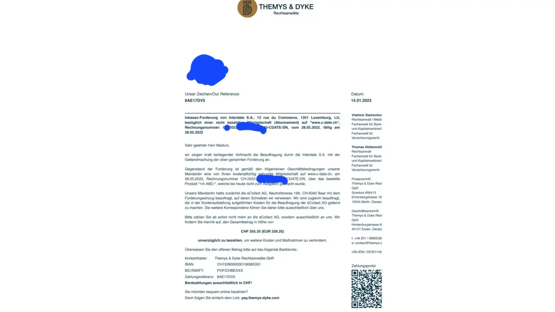 I receive a letter from Themys & [censored] Rechtsanwälte GbR treating me if I don't pay more than 300 euro I try to log in to see if a ihave a subscription but I'm not allowed to log in I pay this and I still not allowed to log in to cancel and delete mine account please stop scanning me and stop treating me I paid already.