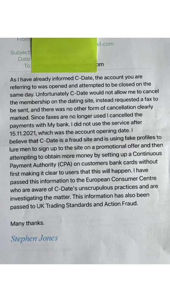 I see C-Date have been active since my post, no surprise they have chosen wilful ignorance, just as you have with all communication so far, i will try one more time to contact you with all requested information minus the option to take my beloved money you are so desperate to get your hands on. I only wish to cancel my membership and despite your statements in the T&C's that you make it as easy as possible, I find the opposite to be true, as does everyone here at this complaints site. You purposely mislead your users and only want money with zero legitimate options to cancel. No statement about future costs are given when signing up and you jokers then request a wet signature, which is not a legitimate statement, as no wet signature was used to sign up with you, you then give a defective link to send the stated request for a paper cancellation with a wet signature, the sheer audacity of your business model is as astounding as your ignorance of communication attempts. If my membership isn't cancelled before your stated cutoff date on 2.2.23 and you use your bully boy tactics of employing debt collectors, then I very much look forward to seeing you in court.