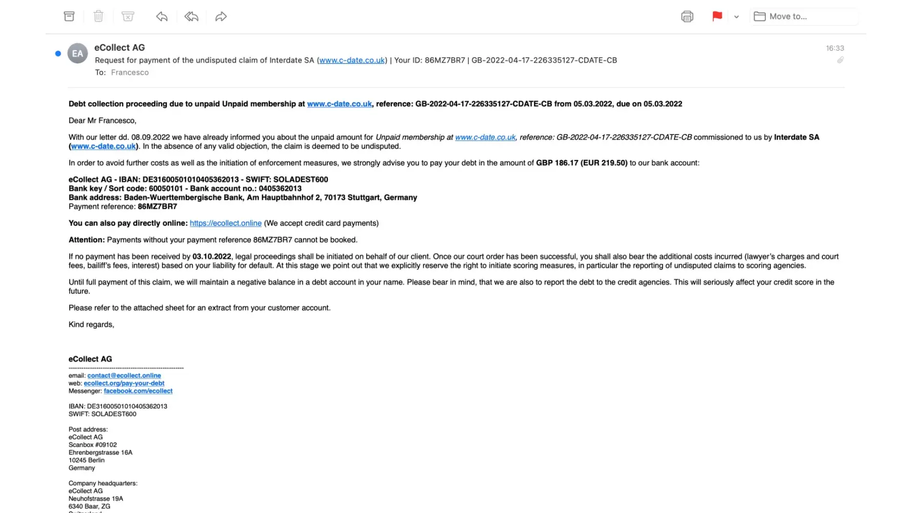 Today I got a threatening email claiming that debt collection proceeding would take place if payment was not made within 7 days.