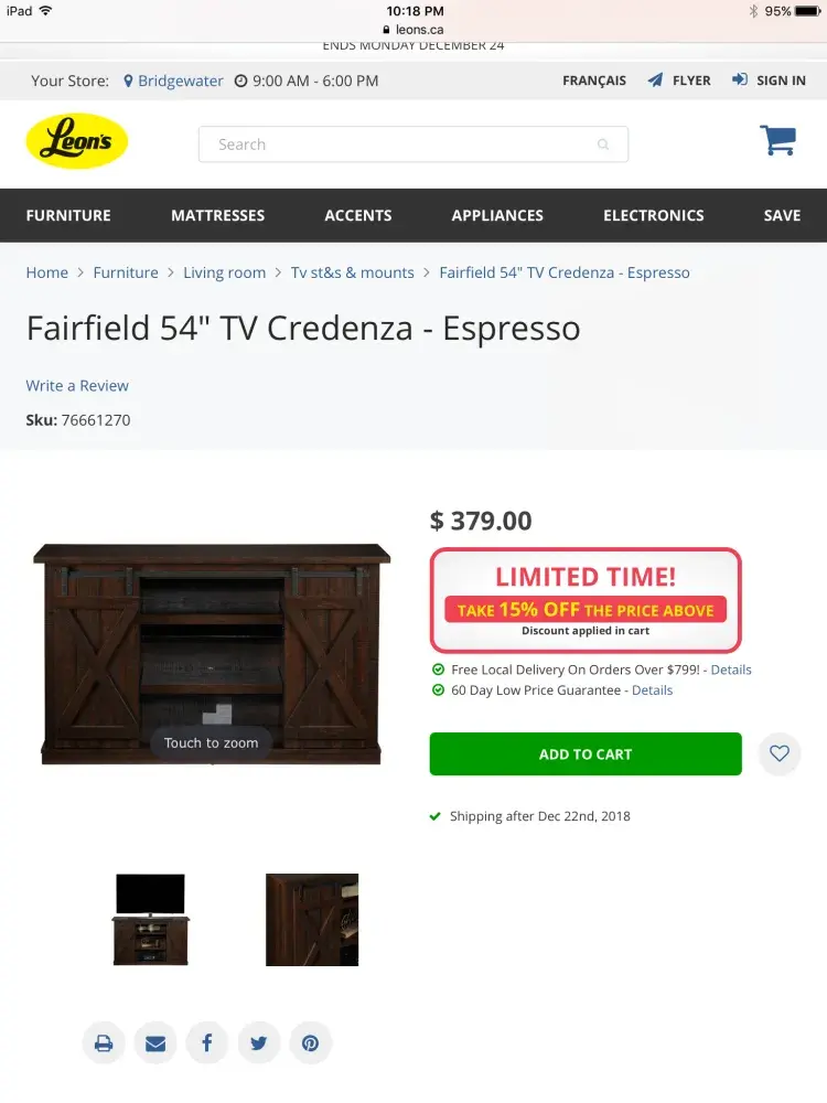 I was at Leon's on Monday December 10th specifically looking for a TV stand I went to your electronic section of the store and I asked if there were any chocolate brown TV stand that I could look at there weren't any on the floor so Asked me if I was interested in looking online . I agreed and found one that I liked t was the Fairfield 54" TV Credenza - Espresso he made a call to see if was in stock they said yes but explained that it wasn't assembled. I asked him if I came back in a few days could he have it assembled so I could look at it and he said no they don't do that. He gave me a print out of the TV stand and sent me on my way. I began to browse a bit more and another associate from the main floor asked me if I was finding everything ok I explained what took place and she said "Don't mind him he"S new" She paged him and asked him " Do you want me to show you how to get stuff out of the warehouse ? He said ok so him and I went to the warehouse and it was a box not assembled. I left disappointed 😔
