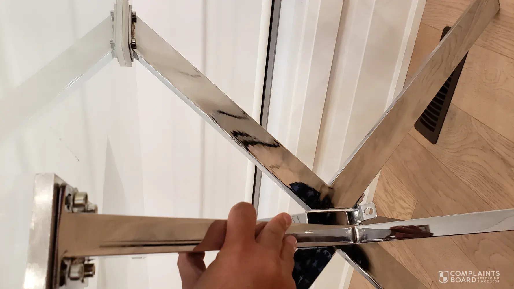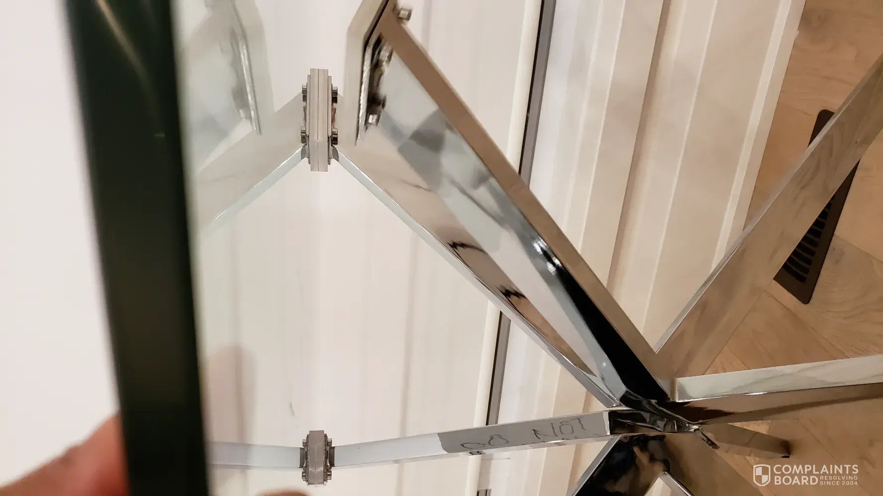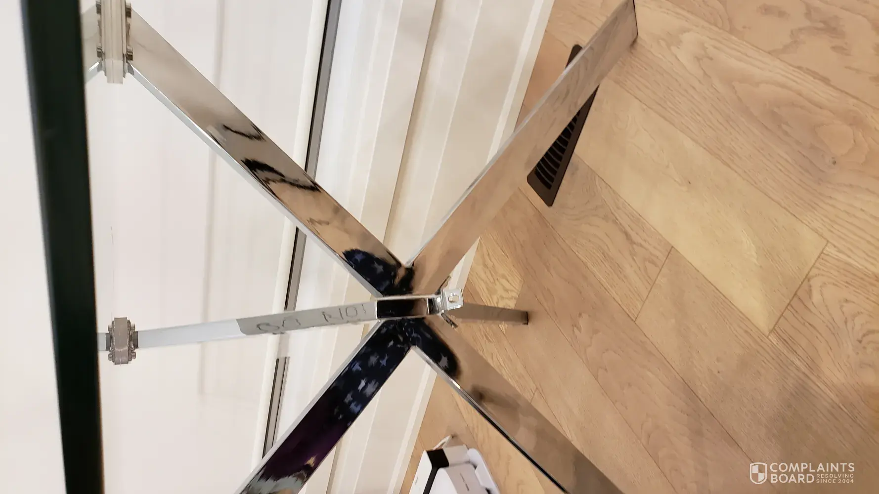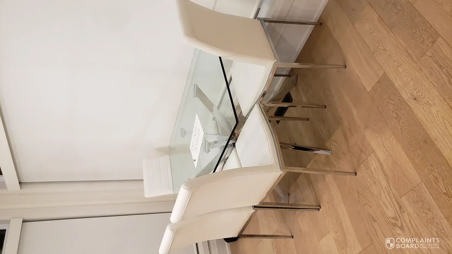 I was told to go to the hardware store to find a solution. This was unprofessional and unhelpful as you are the vendor. We do not need to seek additional advice from a furniture store on how to fix furniture that was purchased at your store. We have a young baby and this is where we have family dinners. This has now become a hazard in our home. we have to push the chairs in to support the table leg and prevent the glass table top from falling.