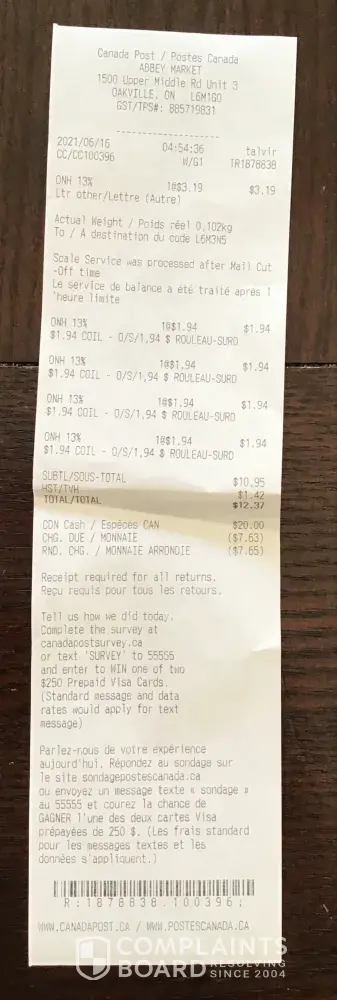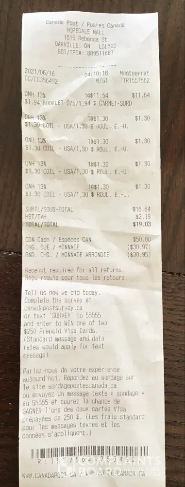 When finally she understood, she said no! Ones I put a stamp on un enveloppe it's property of canada post and I the costumer can not touch it anymore to put the return prepayed enveloppe inside. I said Ok I understand. So I told her that the solution was for me to buy stamps for the prepayed enveloppes 1st and put them inside the enveloppes that contained my documents. She pretended that she didn't understand again. I told her how about if you weight one enveloppe (I choose the heaviest one) and give me 10 same stamps and I will put on the eveloppes my self. She then said OK. She went to her register to pick one sheet of stamps that contained 6 stamps each for $1.94. She then grabbed an other sheet to complete to the 10 count I needed. I payed 19.03.