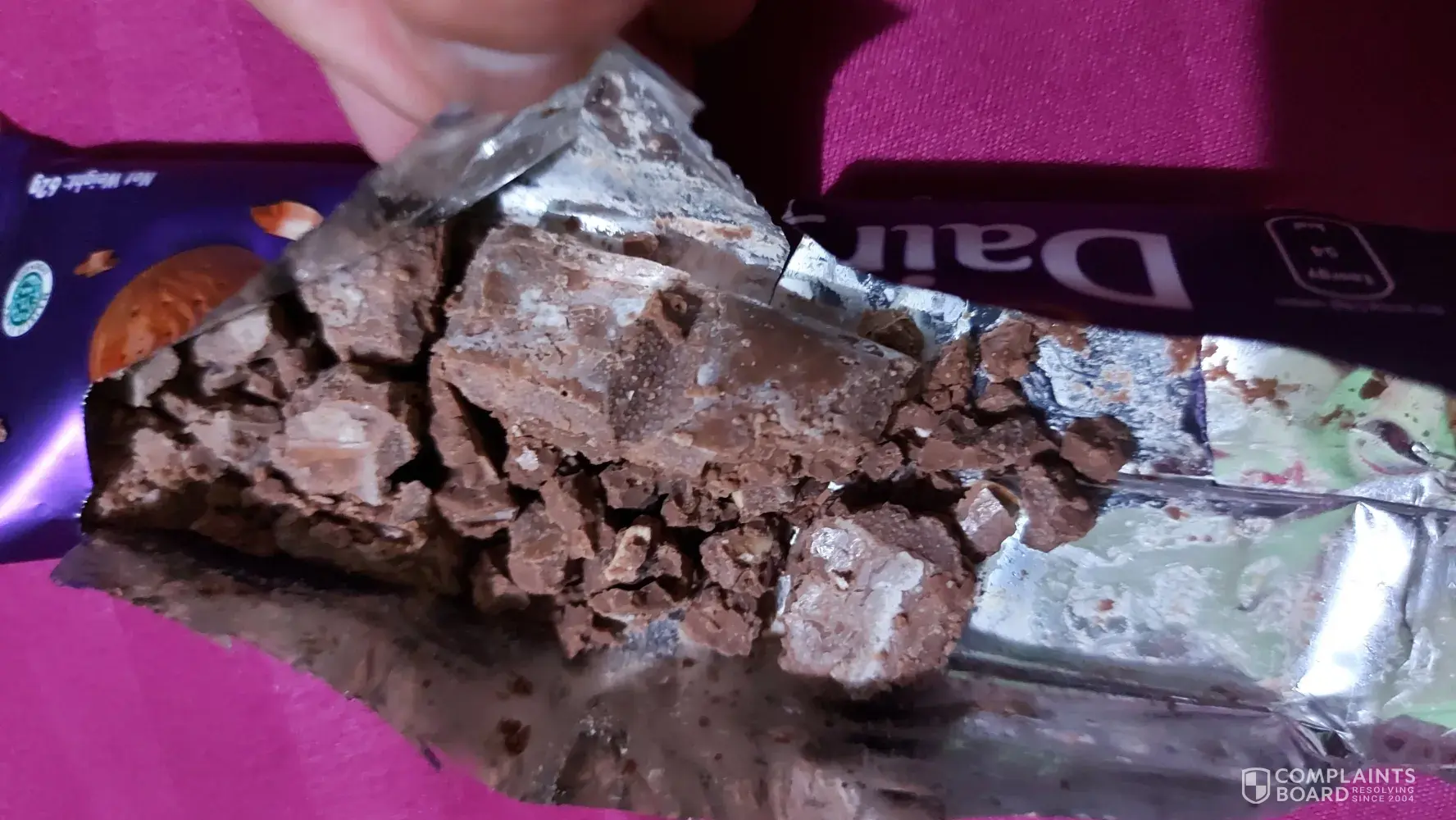 Today on 22 july 2021 I bought a Cadbury dairymilk silk roste almond choclate from a store in Guwahati for my sister. She began opening the dairy milk after coming back home and noticed some white partials on the choclate.