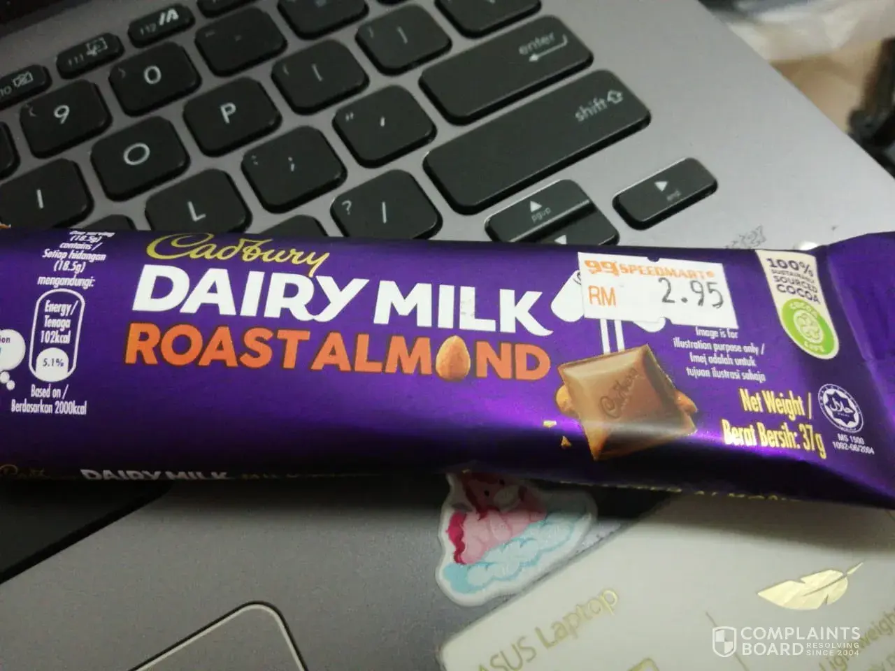 I bought a bar of chocolate CADBURY ALMOND CHOCOLATE BAR at 99 Speedmart near my house. After a few hours of reaching home, I decided to eat the chocolate, to my surprise when I opened the chocolate packet, there were tiny spots on the chocolate bar, and the texture of the chocolate was crumbled and there were also white spots on the rest of the chocolate bar.