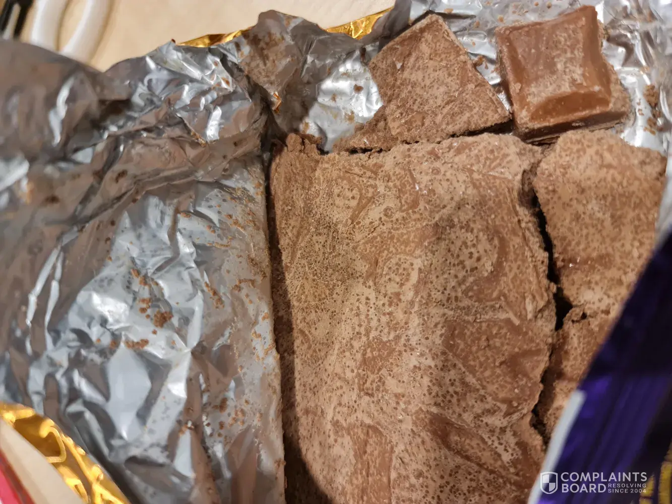 About 3 weeks ago i purchased a DAIRY MILK SILK RED VELVET oreo from a retailer where the chocolate was not in good condition and to be mentioned the chocolate packing was not good the inner cover was too wet and i noticed that the chocolate had avery bad smell with black spots and i feel unsafe to eat this chocolate i have attached th chocolate pics below kindly see to that and i request you to do a favour for me