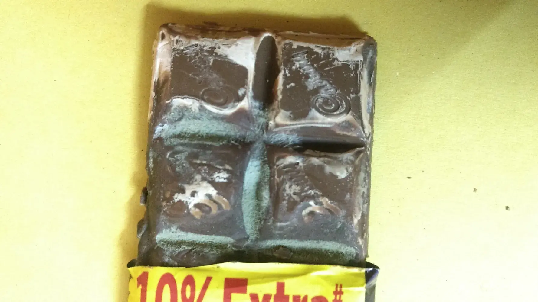 I bought a chocolate bar from a store nearby, and it has literally fungus growing on it, it's not that whitish layer, it's even more disgusting. There are some little buds growing on it and the chocolate is so brittle that you can crush it into powder with your fingers.