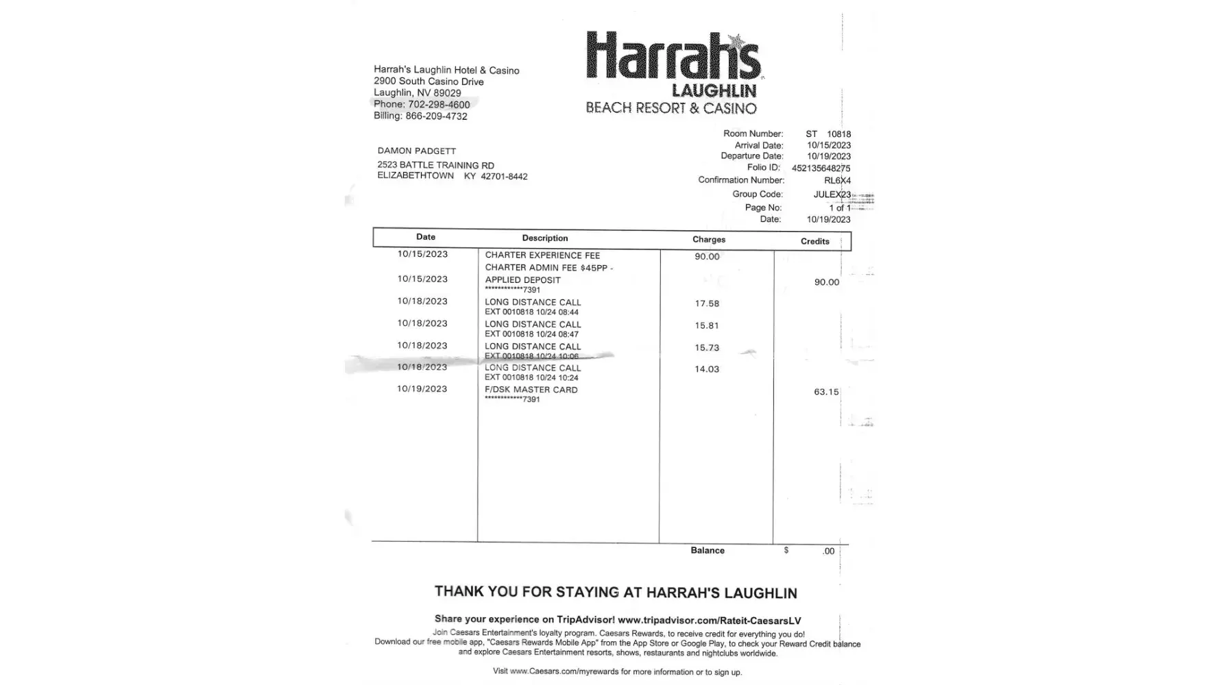 We stayed at Harrah's Laughlin Oct. 15-19, 2023. We found that the food was extremely expensive, We checked out through the tv. I notice that it had charges for a total pf $63.15 for long distance calls that we didn't make. We never used the phone in the room at all. I used my cell phone. I tried to explain this to the desk clerk. She informed me that I had made the calls. I even showed her where I had made calls from my phone. They were to a car rental place. I told her that i still didn't use the room phone and she proceeded to tell me that I did. I felt like she was calling me a liar. I have never had an experience like that in my 69 yrs. Such disrespect. All she would say was that I did use the room phone.