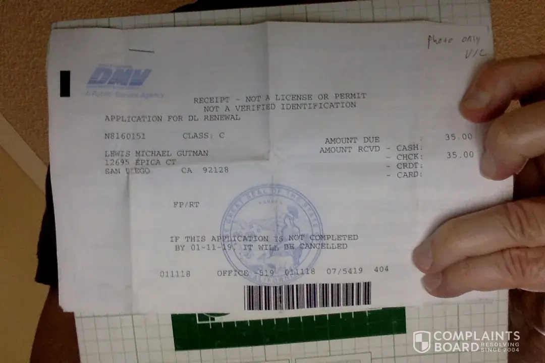 In January 2018, my license (#N8160151) expired. I went to a DMV in San Diego Co. and after taking an eye exam and photo and paying $35, received a temporary license and a promise that a new license would be mailed to me. I have not received the new license yet: 4 months since I renewed.
