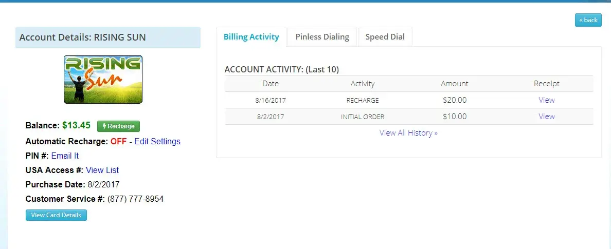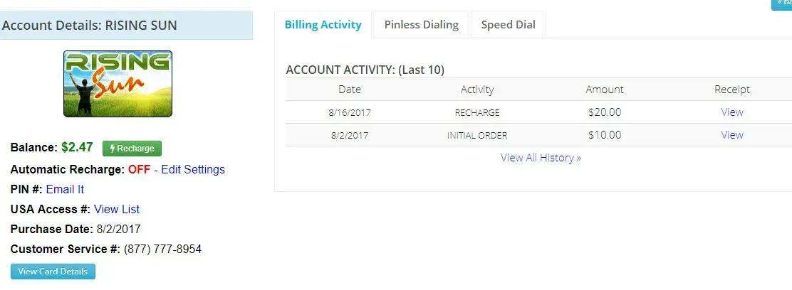 Rising Call calling card is a rip-off. It tells you how many minutes you have left, dial the number you're calling, hear the phone ringing then a recording tells you your outgoing calls have beeb suspended. Called customer service at 1.800.680.5396 Told me card has no balance and card haven't been used since 2020 when in fact used it a couple days ago for ~2 minutes with $4.00 remaining. Card says no fees, no expiration but now being told no more credits left on the card and to get rid of it. Used another brand new card but it doesnt ask for the pin (account number), gives language option, to dial phone number so how does it know the balance on the card. Asked the customer rep if card is tied to phone number and said it isnt. With the new card it only said my balance is $4.00 yet I haven't made a call. This company is ripping people off and should be shut down!