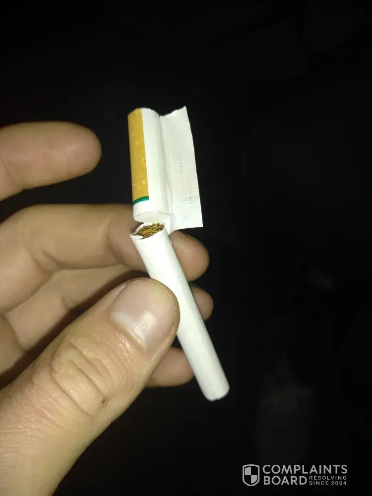 I'm just concerned about the quality of your brand lately. It's not the first time I found it like this, but this time I thought that I just bring this under your attention because at the end of the day I am paying for the product. The filter of the cigarette was completely damaged with an extra piece of paper around it. I took several photos as I took the extra piece of paper off. This is not very good service.