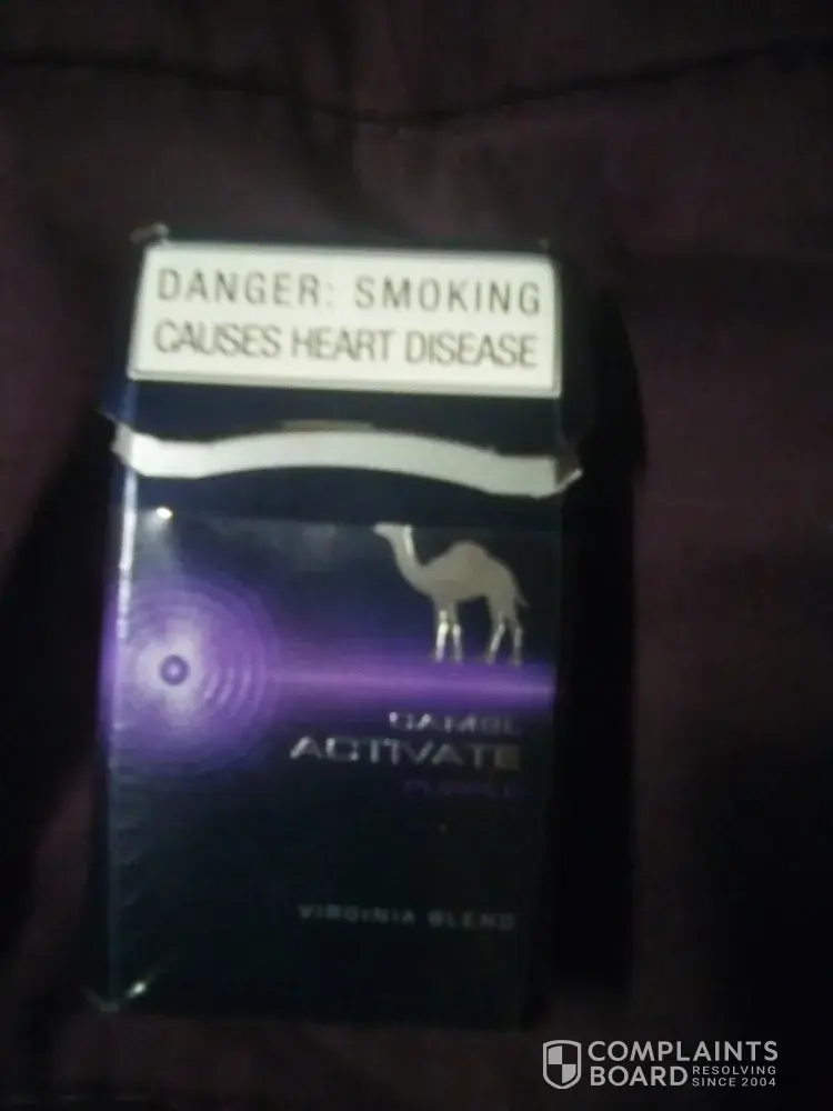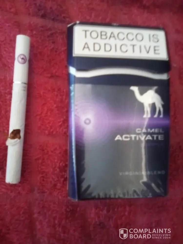 I bought a carton of Camel Activate Purple Cigarettes as usual and found 1 broken cigarette in 6 packets sovar (photos is available for evidence) I find this very dissapointing and I am very upset as I pay alot of money for this brand on a regular basis. This is unexeptable! I want a new carton of Camel Activate Purple with no defects!