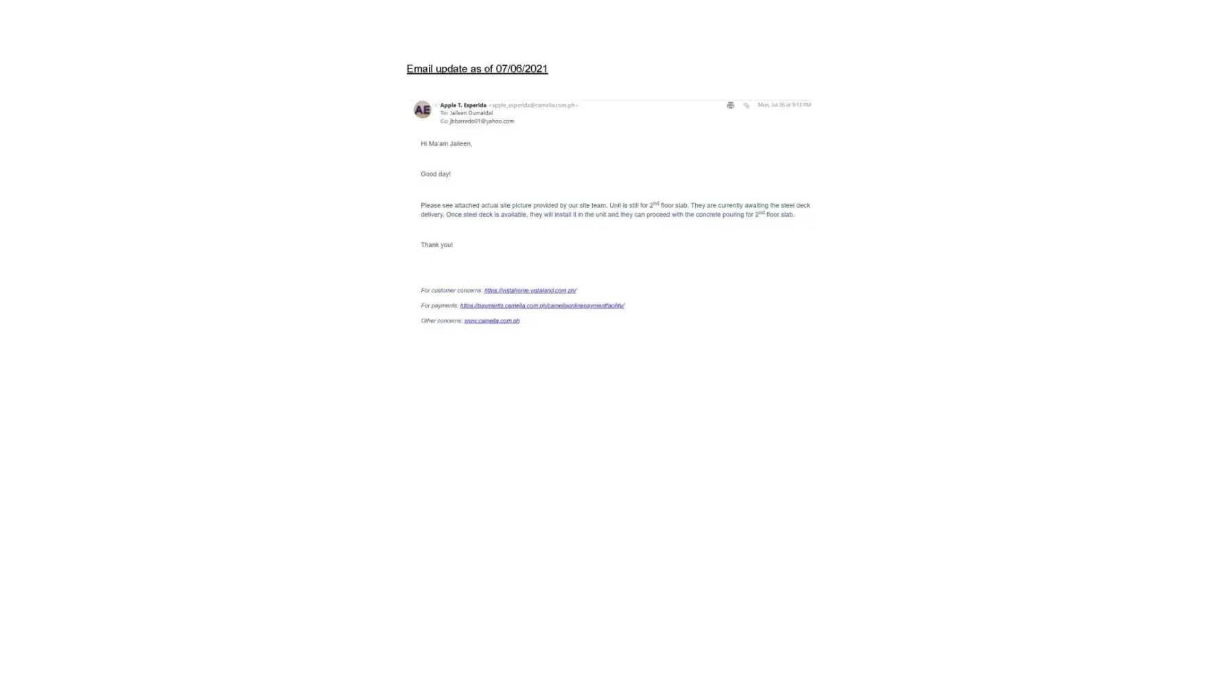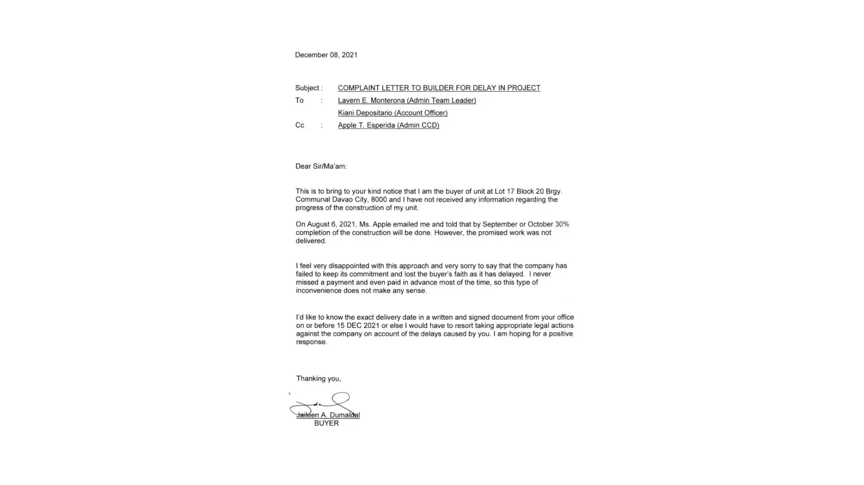 I purchased my unit on May 06, 2019 and paid P40,000 reservation fee and fully paid the required down payment by May 30, 2020 (within a year) amounting to P769,284. After that I am paying in house until 30% completion is reach as per the requirement of the bank for 1 year and 4 months. Total payments made is already P1,576,998.73. As per contract, 5 months from the start of paying the down payment construction will begin and within 18 months it should be 100% complete and with a year there will be a turnover. I am very diligent in making follow up since I am overseas (in U.S. ). In June 2021, after 2 years and one month construction is still at 15%. I am asking them to have a commitment for the 30% completion since I am also working on securing the bank loan and processing the required documents but there's no any good feedback from the "Engr Apple". They just keep on "acknowledging receipt of my email". I am losing HOPE and its giving me so much inconvenience (financially and mentally). I’ve been very understanding and patient about the COVID-19 Pandemic situation as your reason for construction delays. But I needed a commitment of 30 % project completion as required by the bank for my loan. On August 6, 2021, Ms. Apple emailed me and told that by September or October 2021 30% completion of the construction will be done. However, the promised work was not delivered. This makes me feel that your company are not taking your client seriously and will not like to pursue contract to company with such values. I am losing hope. I wanted to pull out my funds, I already sent a formal letter to terminate the agreement but I received no feedback just "acknowledgement of your email".