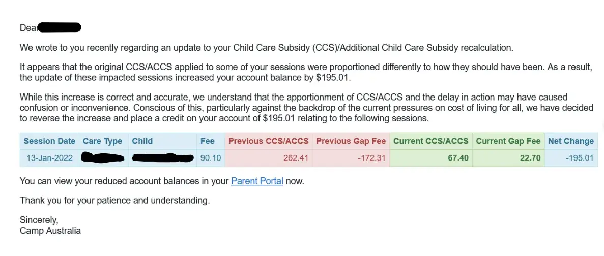 -I raised a query through Camp Australia online as it appeared to be related to more recent transactions (due to alleged amount equalling exactly what I had paid in fees this year). I had no response from this or indication as to whether it was reviewed until being told my account was excluded. I then called and received the same response around it being a CCS charge from 21/22.