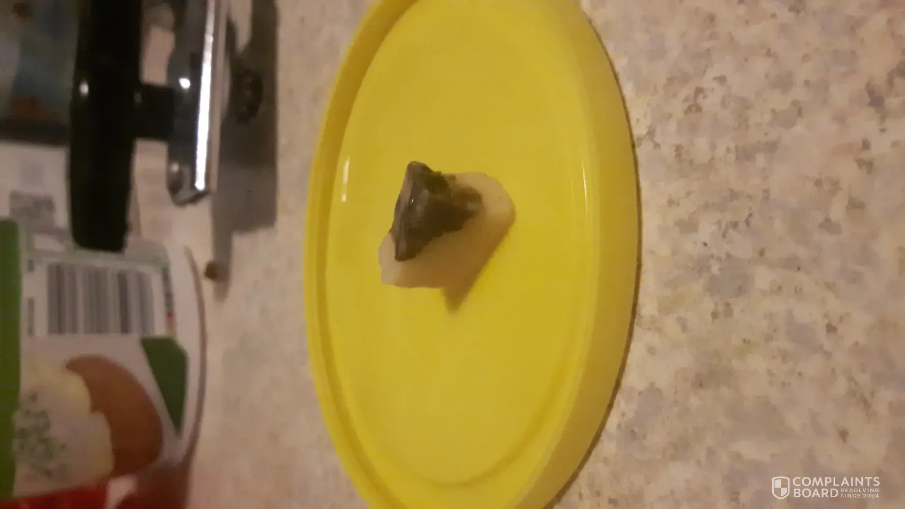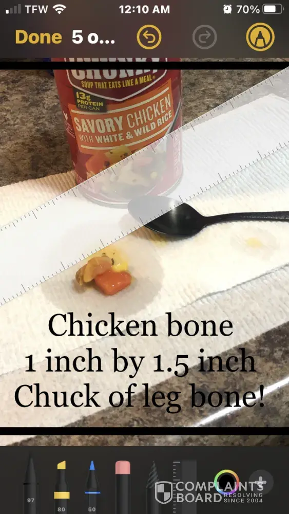 September 20th 2021 I opened and heated up a can of campbell's soup near the end of my bowl I bit into a rock that had been inside the can of soup that caused a large chip in my tooth. I now have dentist bills to repair the damage done to my tooth as well as dealing with the pain and extreme sensitivity caused from the break in my tooth which cause me to miss the last 2 days at work and will cause me to miss work until it is fixed. I would like to be reimbursed for the bills I now have as well as for the lost wages from having to miss work.