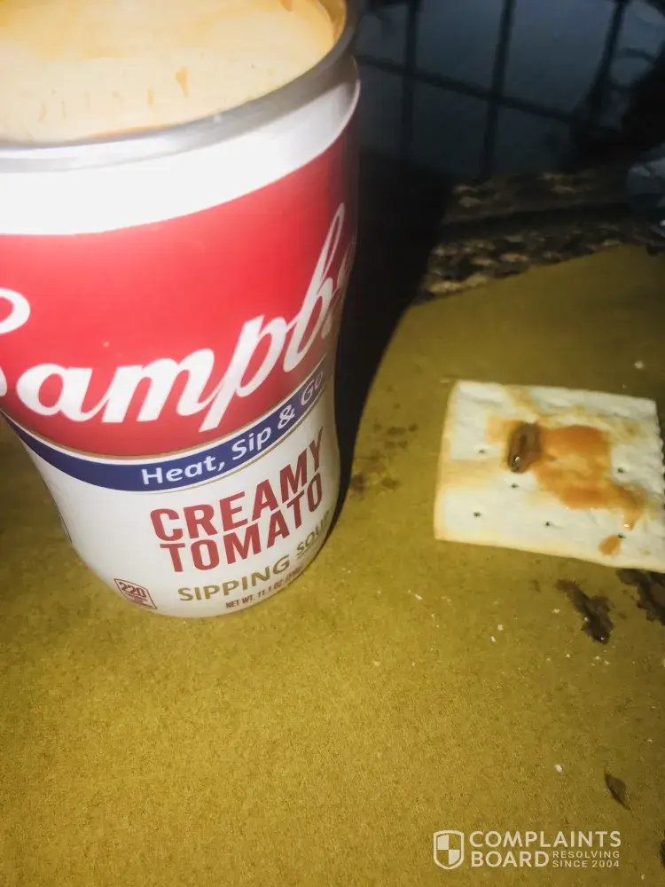 Cockroach was in Tomato soup, cockroach was full bodied. Please do not ever ever sip this soup from the can. I heated in microwave in can then didn't put lid back on, Thank God. I didn't sip it but spooned it. There was a full bodied cockroach in the tomato soup. Seen it after I ate about 2 inches Of soup and stirred it... Was sick to my stomach. Threw up...