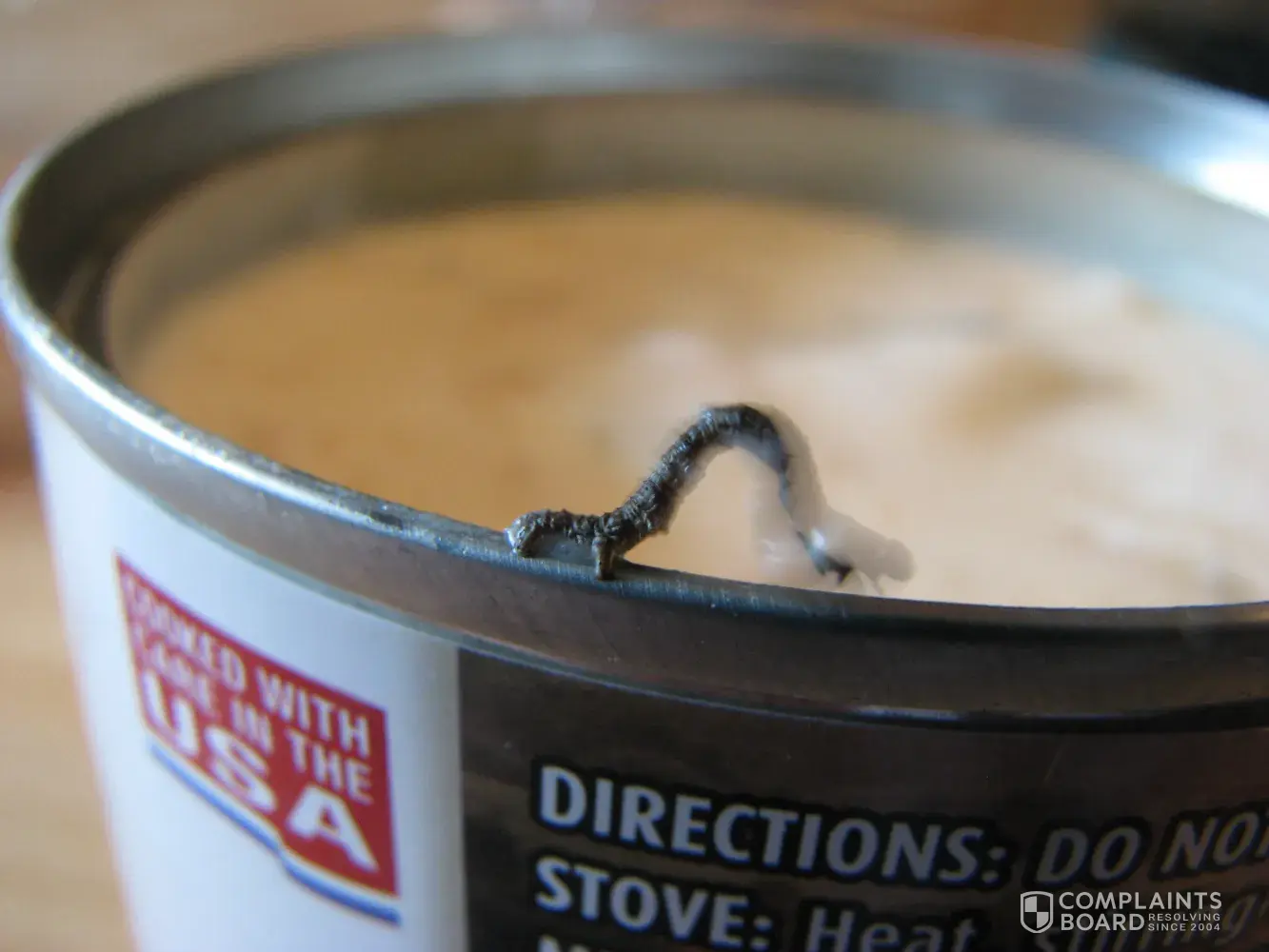 I opened a can of campbell's select harvest clam chowder and found an inchworm floating on top inside the can. I thought it was dead, but I scooped it out and it was very much alive. I called campbell's and they took down my information and offered to send me a coupon. I refused any coupons, because I can never bring myself to purchase another one of their soups again.