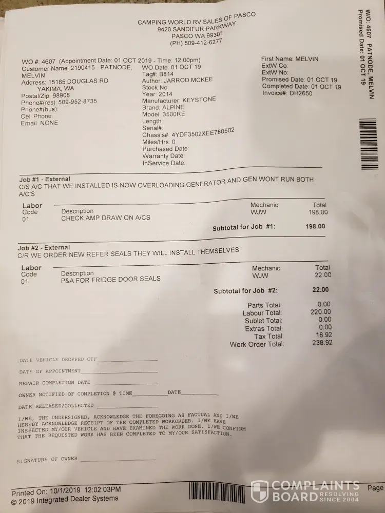 By this time it is July '19, and I have had enough of camping world. I had my insurance company reissue a check to another camper sales.