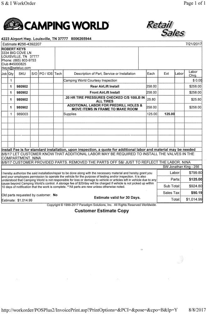 I knew I would have to pay the regular labor rate for the time which was posted as 129.99 per hour, however it did not say per man. They had my camper for 4 hours and I feel like that charge is fair, but they cannot charge me for the 2 hours to install the front springs since they had already been installed and the supplies charge, really. I could live with 50 bucks but 125.00, the floor must be gold in the shop. I have shopped at camping world for years but never used the service and installation dept. And I can assure I will never use them again and will let everyone I know to never use them. I will say the techs do really good work, but I hate being robbed at the counter by people that have no clue and can not offer any better explanation than what they had. Attached is copy of invoice showing where they charged me for the front install.
