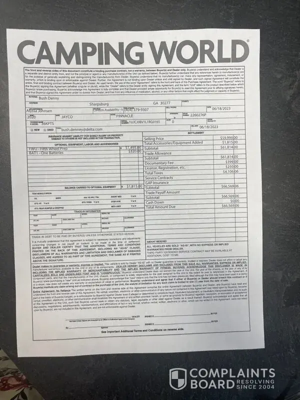 My wife and I purchased a 5th wheel trailer in June 2022 in Oakwood, Georgia. Camping World pulled the trailer to the lot we rented and first rattle out of the box the Bedroom AC did not work. It took 4 1/2 weeks to get an AC. My wife and I had to stay in a Hotel during that time due to it being Summer. That was extra $ 4,200 we didn't count on. After the...