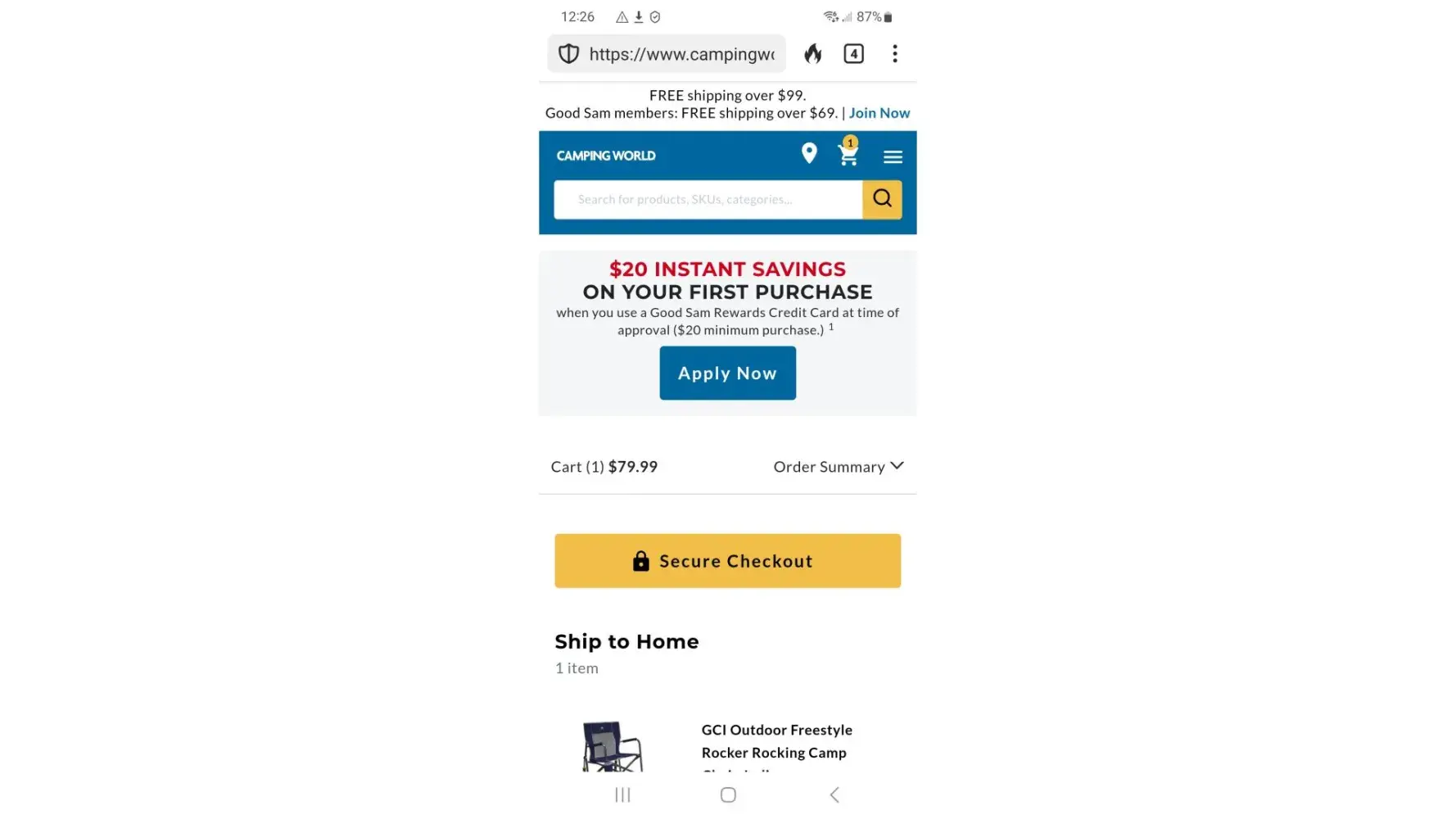 Attempted to take advantage of relationship with Good Sam by using their discounts advertised on Camping world email ads. They offer Good Sam discounts on a few items, but when you order you lose the discount to shipping due to the discounts dropping you below the $69 shipping case. Also, does not add on 10% discount for being a good Sam member.