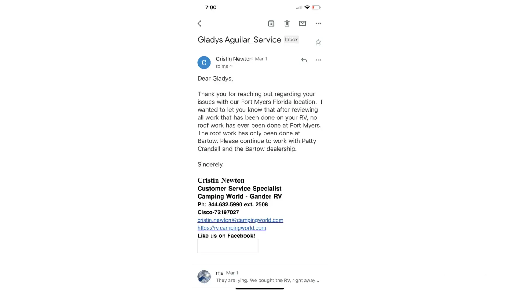 They denied selling me a brand-new RV with a bad roof. They denied fixing my RV when I first bought it. I am so glad I found the initial work order! This is what I picked up on Saturday. Shame on the company. This woman from the Camping World office says my roof has been fixed in Bartow, FL ! What is she talking about? This is how my RV was returned because of their good for nothing overpriced extended warranty. They sold me a lemon! By the way, I bought the most expensive one to make sure this would not happen! Why does is says up there extended warranty resolved! Not true.