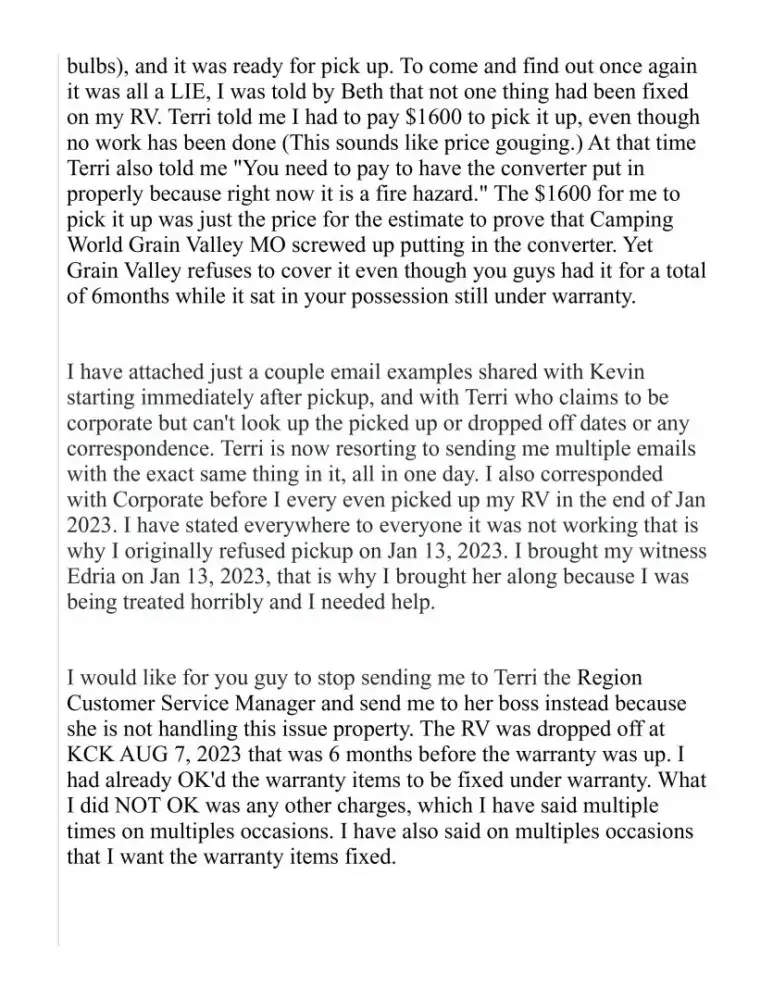 May 1st 2024 NOW I'm being told that if I don't pay for it FIRST (they haven't fixed anything) then pick it up by May 10th 2024, I will start being charged storage. Yet it was only April 8th 2024 that I was told that Camping World KCK already completed the work and fixed all the warranty work (converter, slide out, light bulbs), and it was ready for pick up. To come and find out once again it was all a LIE, I was told by Beth that not one thing had been fixed on my RV. Terri Bartlett (Region Customer Service Manager from Grain Valley Claiming to be Corporate) told me I had to pay $1600 to pick it up, even though no work has been done (This sounds like price gouging.) At that time Terri Bartlett (Region Customer Service Manager from Grain Valley Claiming to be Corporate) also told me "You need to pay to have the converter put in properly because right now it is a fire hazard." The $1600 for me to pick it up was just the price for the estimate to prove that Camping World Grain Valley MO screwed up putting in the converter. Yet Grain Valley refuses to cover it even though Camping World KCK had it for a total of 6months while it sat in their possession still under warranty.
