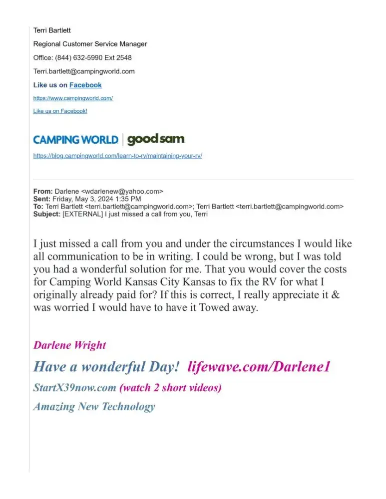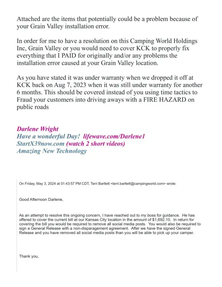 This is the email proving that Camping World Grain Valley MO are trying to rip me off and charge me for another Camping World location (KCK) to PROVE the Camping World Grain Valley Location Wired my RV to be a Fire Hazard but refuses to fix the Fire Hazard & now wants to charge me to prove they did it wrong but are still refusing to fix the installation error.