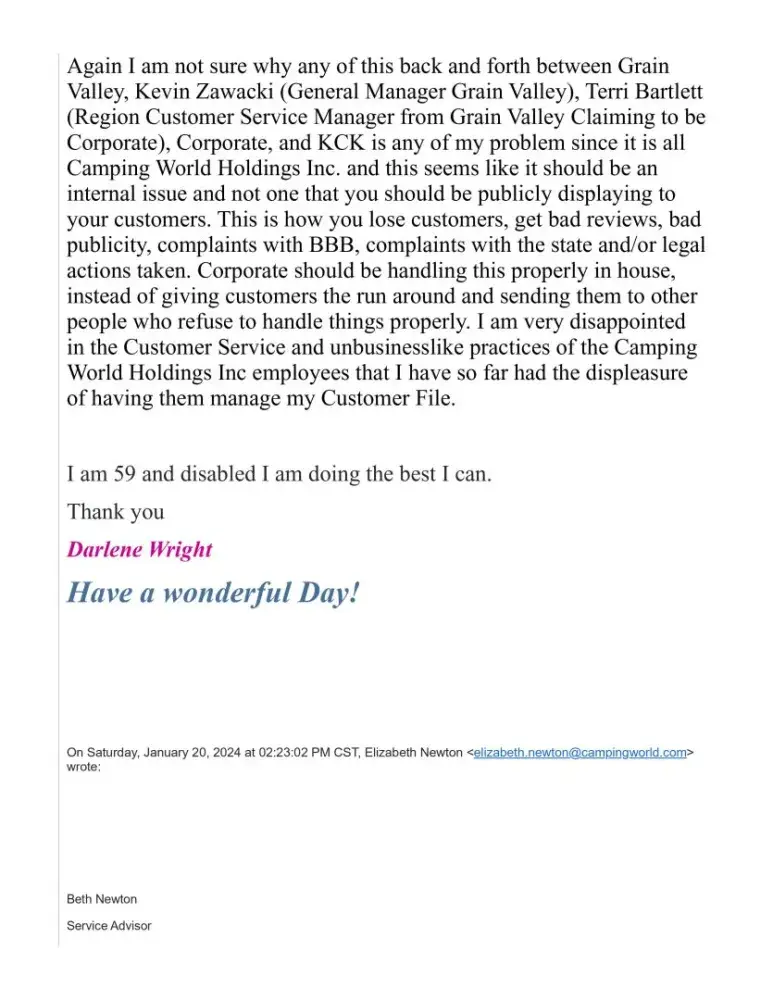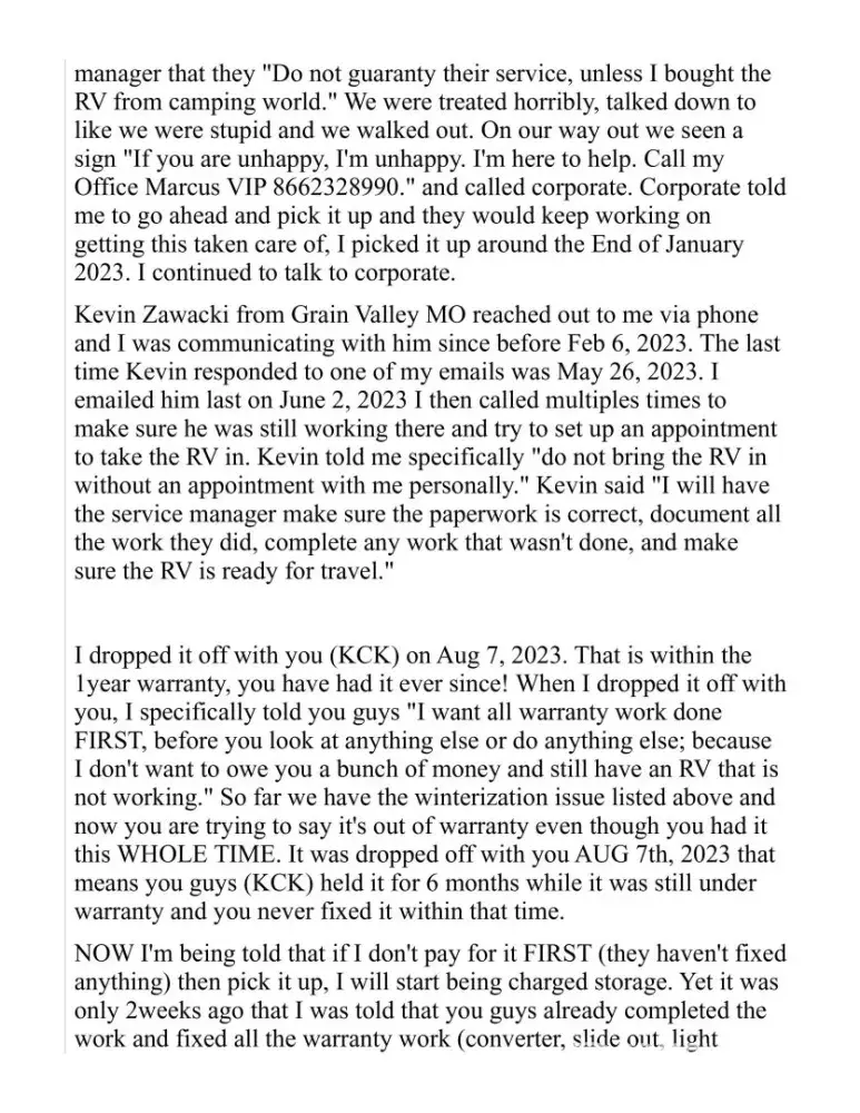 Again I am not sure why any of this back and forth between Grain Valley, Kevin Zawacki (General Manager Grain Valley), Terri Bartlett (Region Customer Service Manager from Grain Valley Claiming to be Corporate), Corporate, and KCK is any of my problem since it is all Camping World Holdings Inc. and this seems like it should be an internal issue and not one that Camping World should be publicly displaying to their customers. This is how you lose customers, get bad reviews, bad publicity, complaints with BBB (by the way they just lied to BBB earlier today), complaints with the state and/or legal actions taken. Corporate should be handling this properly in-house, instead of giving customers the run around and sending them to other people who refuse to handle things properly (AKA Terri Bartlett). I am very disappointed in the Customer Service and unbusinesslike practices of the Camping World Holdings Inc employees that I have so far had the displeasure of having them manage my Customer File.