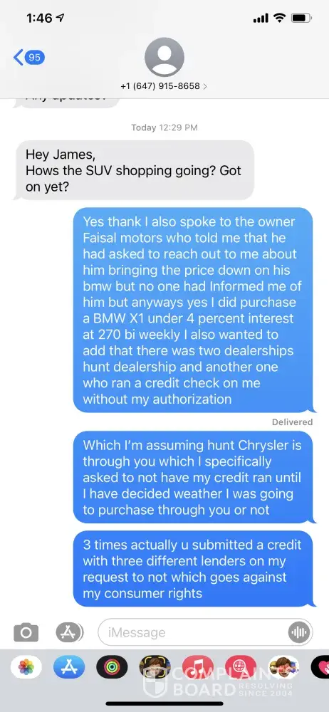 Started making sense why he wanted my pay stub and drivers licence was he gonna close on a deal behind my back ? Very sketchy very ignorant when I questioned him on it after a week buying my bmw from budds bmw he messaged me asking how I made out I informed him I purchased a vehicle and I didn’t appreciate the credit checks after I specifically told him not to until I was ready he blocked me on I message completely disrespectful and disgusting