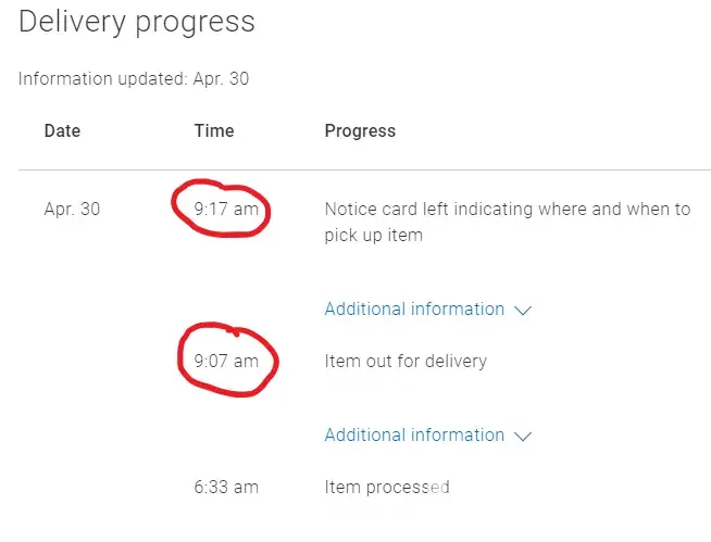 April 27th I ordered a new office chair from Amazon, was a great price, and it was to be delivered April 30th. I happened to be off work on that day, so I checked the status of my chair at 9 am and to my surprise it was out for delivery! Great! Check back on it at 10 am and according to their website, 10 mins after it was scanned as out for delivery, it now said notice left.