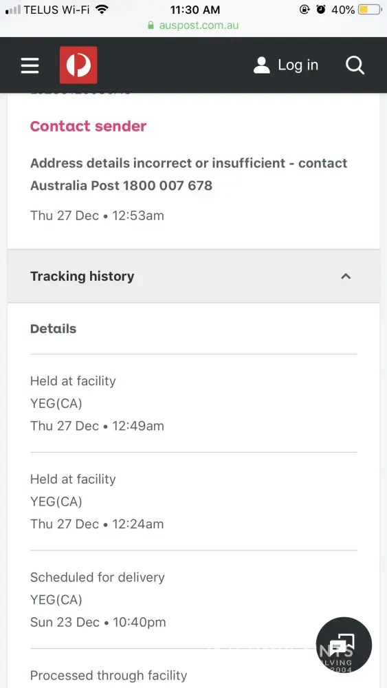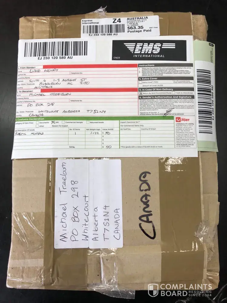 Paid for a parcel from australia, the parcel was 45$ and the delivery fee was 65$. (All the following information is provided by Australia Post tracking) It was mailed on the 4th and arrived in Canada on the 20th at Missiassauga. It was sent to Edmonton, where it went through customs and was scheduled as "out for delivery". Then on the 27th it was marked as "delivery details missing or insufficient". I contacted the sender, they showed me a picture they took of the parcel with my mailing address being correct.