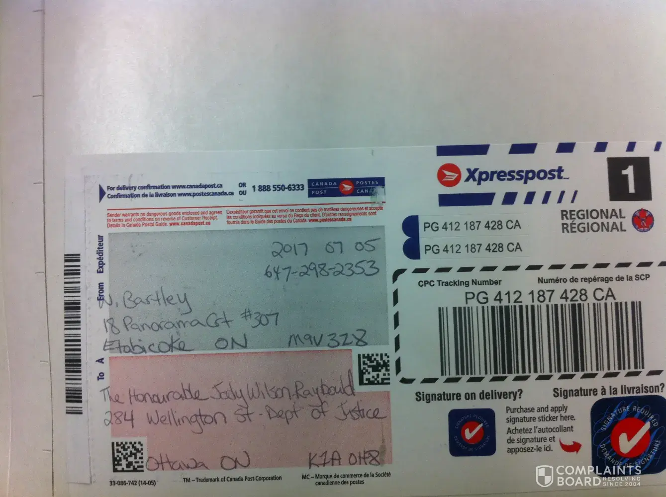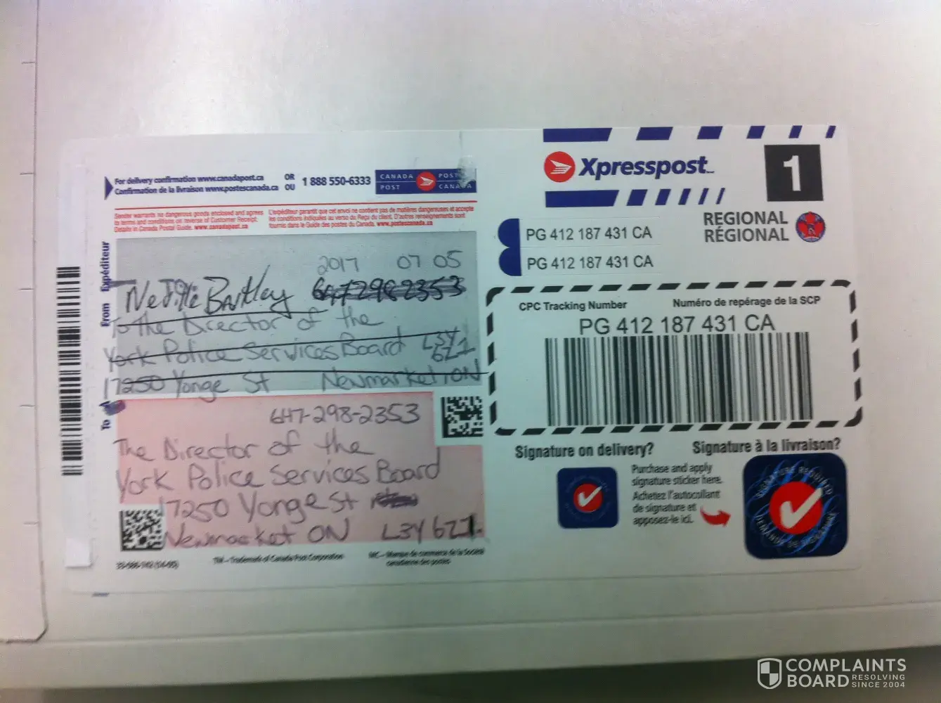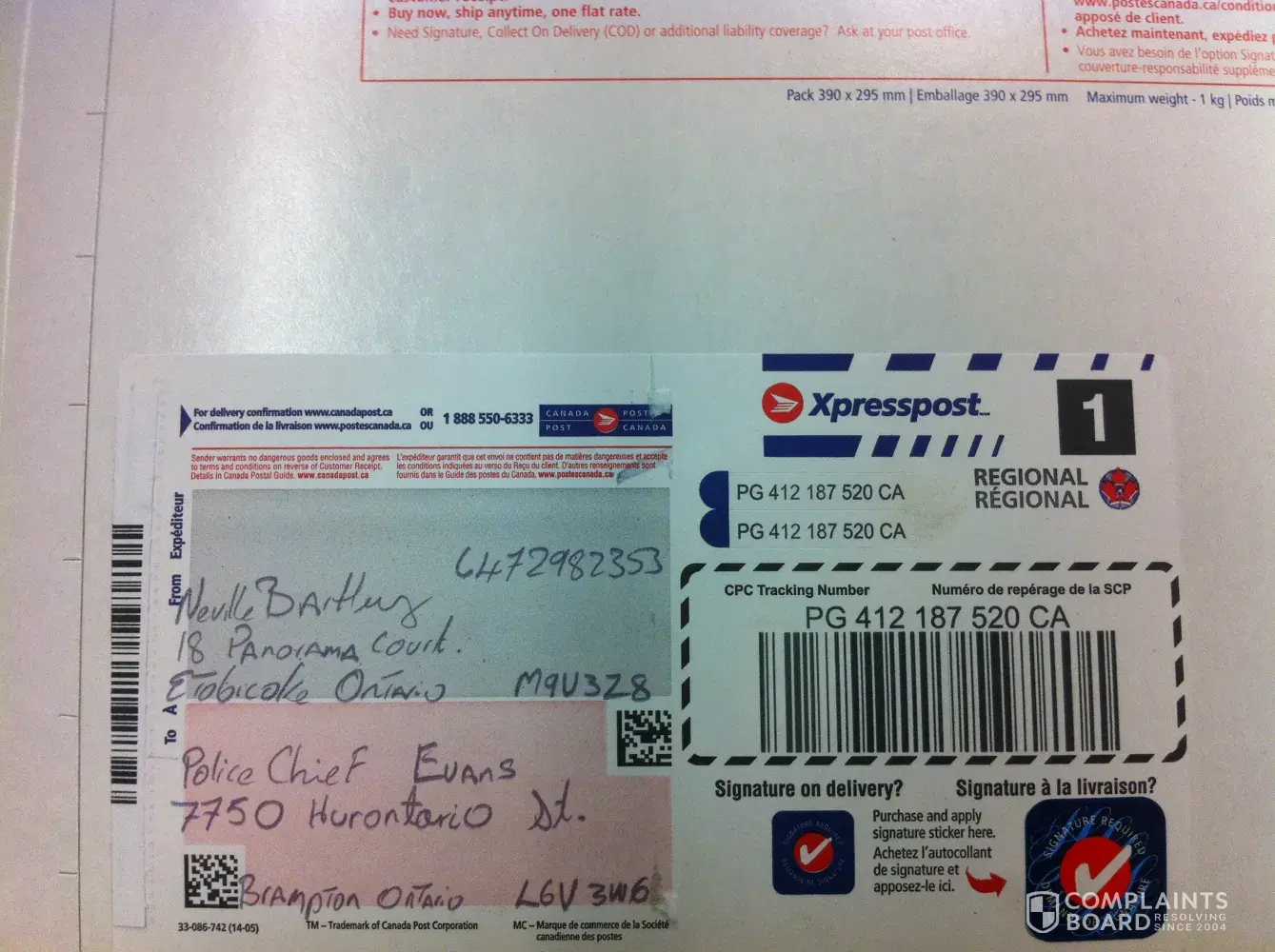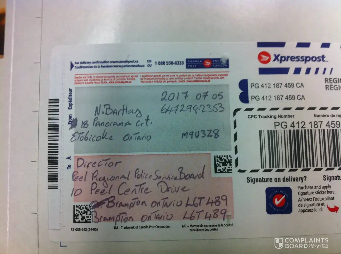 I was told mail was sent to me at two different address I sent documents by Canada post and paid for a signature and parcel went missing to peel police board [protected], [protected], [protected] recently I had to ask my phone company to resend my bill as I have not Recive the last two and no explanation of why a 911 call on April 11, 2016 was not on my bill now I send the last packets sent by Canada post paid for signature on five packets two of the packets was not signed for .
