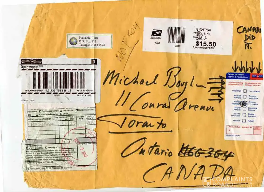 There was a registered letter send from Malaysia that left the country on 12th May 2017 and apparently arrived in Canada on .